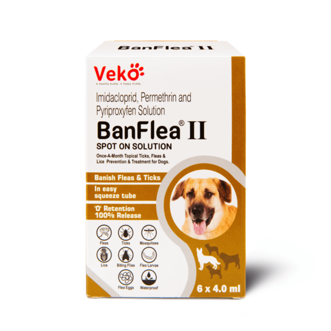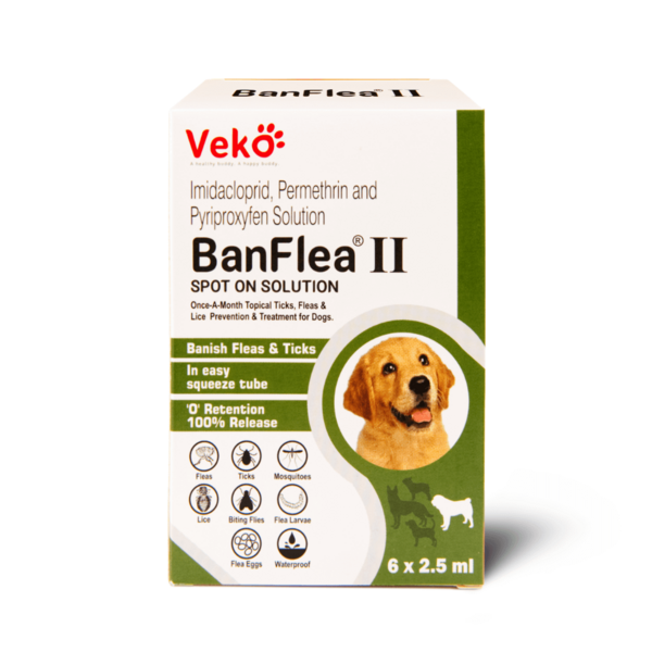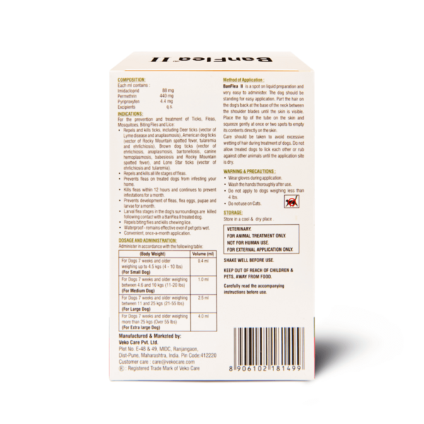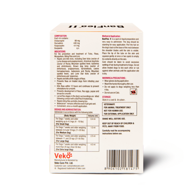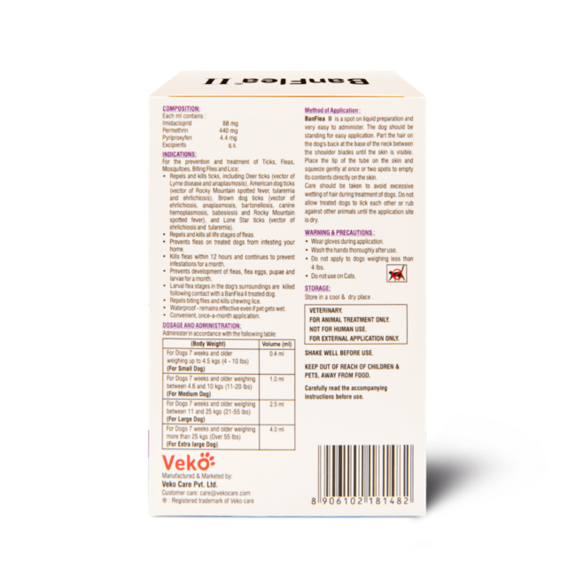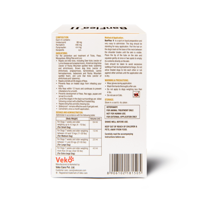 BanFlea II for Dogs, a generic alternative to Advantix II, provides long-lasting, broad-spectrum protection against fleas, ticks, and mosquitoes. Designed to be fast-acting and waterproof, it helps keep your dog safe from pests and the diseases they carry, making it an essential part of your pet’s preventative care routine.